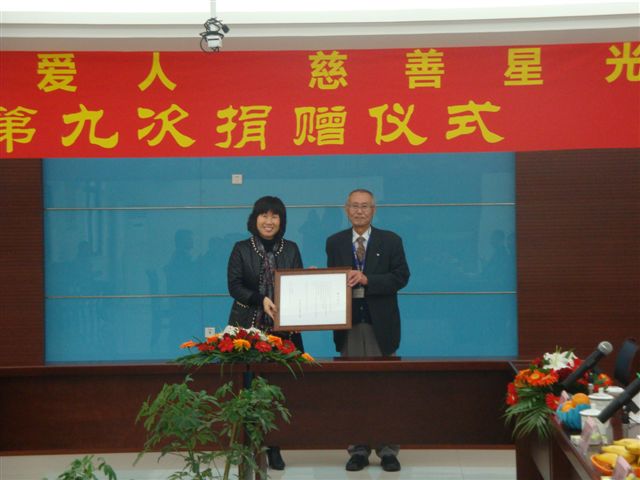 杨院长从坂口董事长手中接过了“敬天爱人”的匾额,社区代表从横山总经理手中接受了“15万元的捐赠款项”。