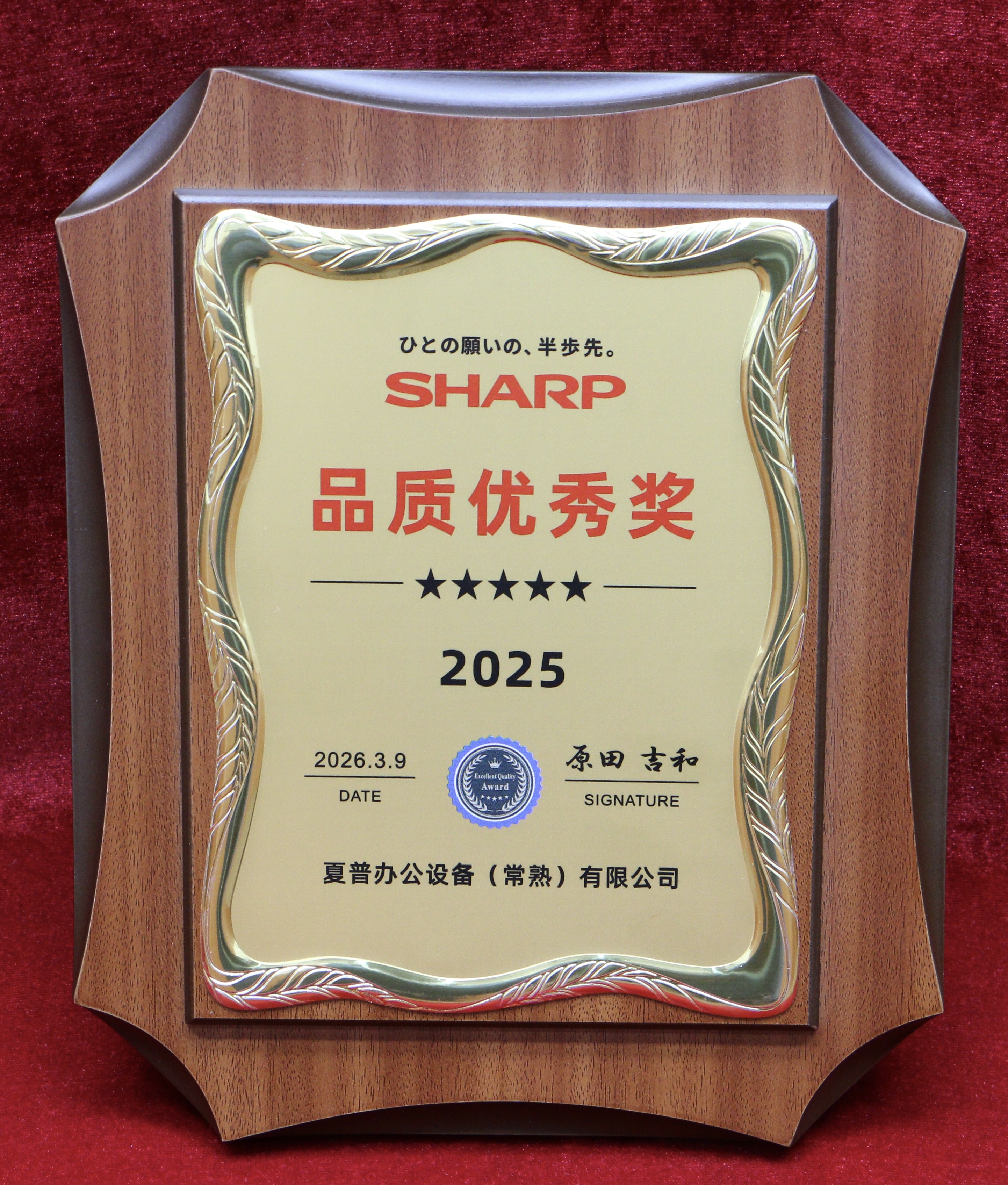 荣获夏普办公设备(常熟)有限公司【品质优秀奖】表彰