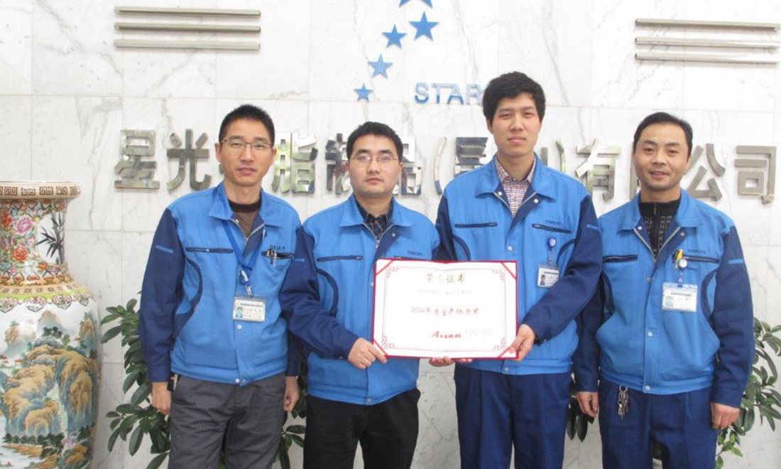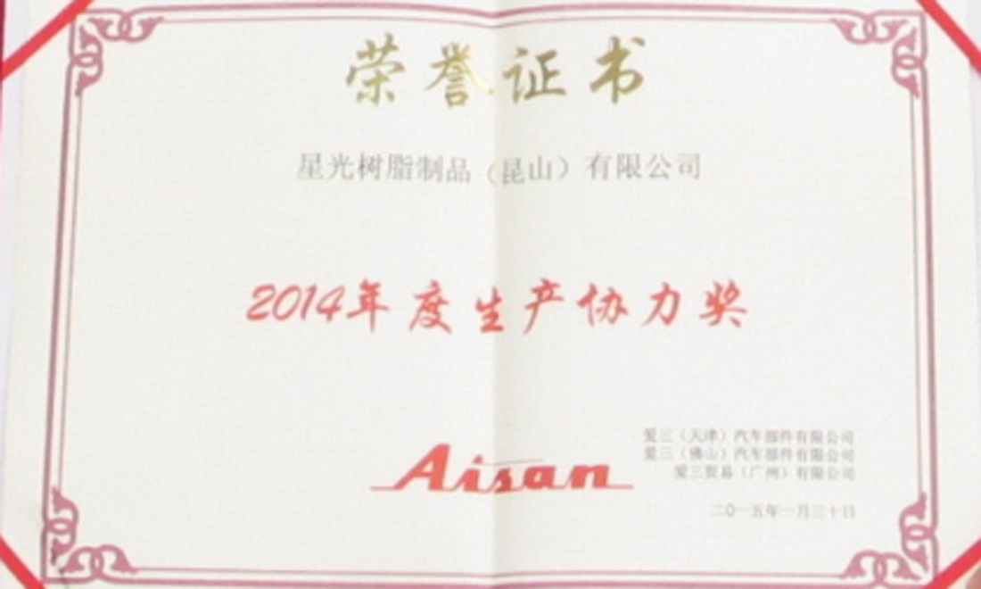 星光树脂制造(昆山)有限公司在全体社员的共同努力下,充分地满足客户需求,特别是在确保纳期与品质最优先方面获得客户高度好评。2015年1月30日在中国爱三集团2014年度供应商的表彰大会上,荣获2014年度"生产协力奖"的表彰。