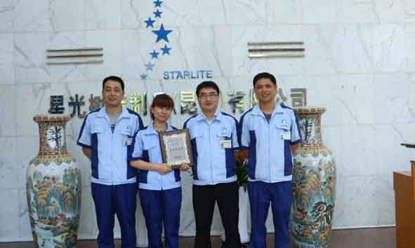 2017年度星光公司在新机种开发、品质、纳期、成本等方面充分关注爱三集团的需求,为此中国爱三集团授予星光公司“2017年度优秀供应商”称号,总经理代表星光公司接受了该表彰。