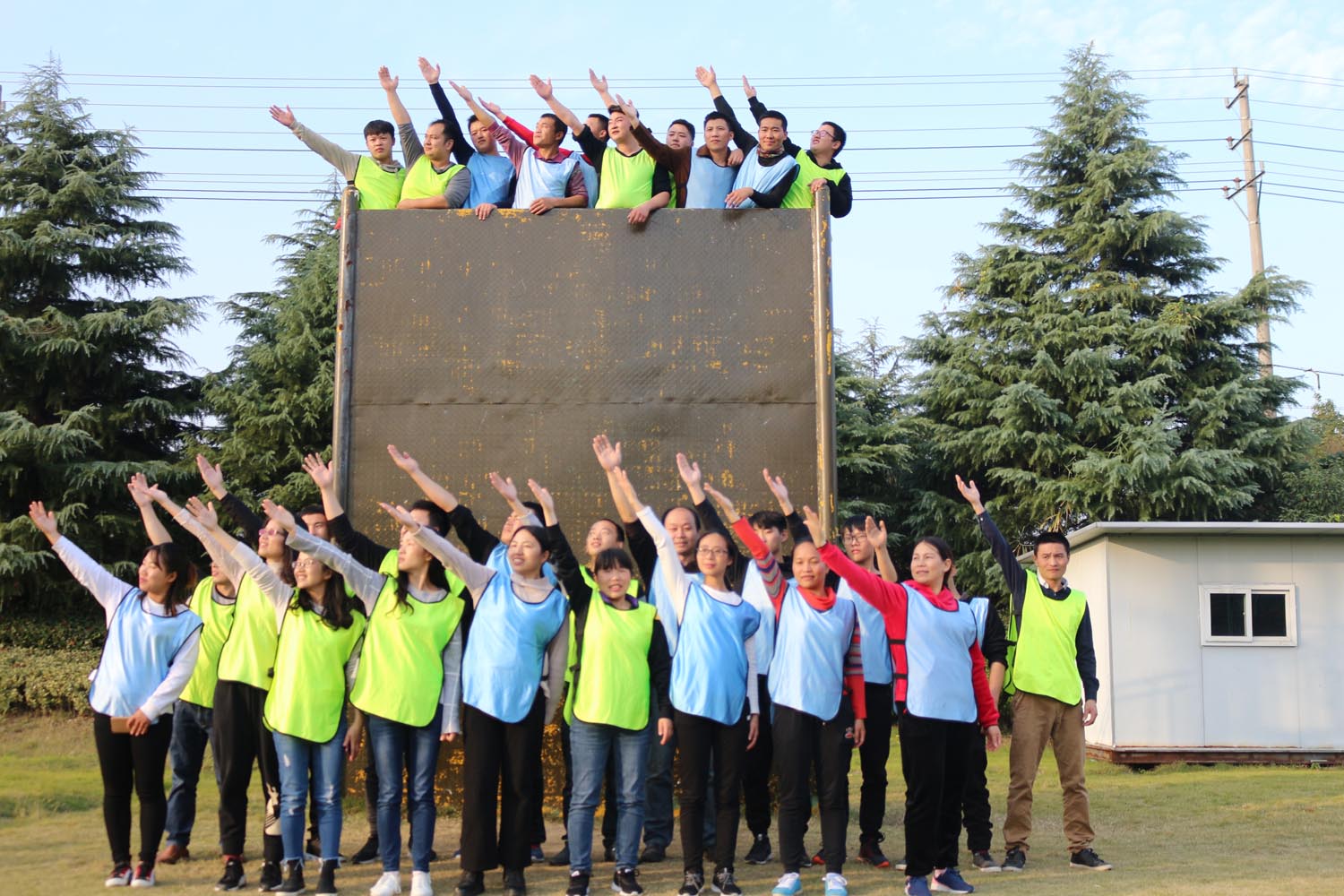 参加的员工分成了2队,分别是小虎队和战狼队,两队一起进行了抢滩登陆、背摔、高空断桥、挑战NO.1和毕业墙的项目,大家热情高涨,积极勇敢参加完所有项目。